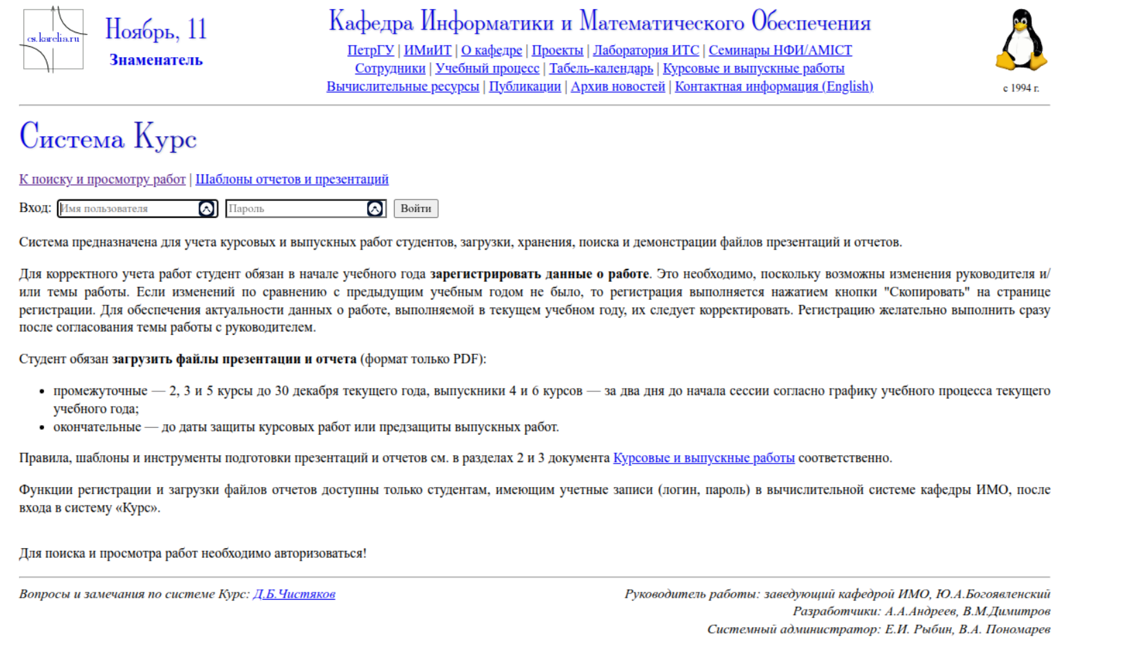 Старшие преподаватели кафедры Информатики и математического обеспечения В. М. Димитров и Д. Б. Чистяков помогут студентам восстановить, при необходимости, логин и пароль студенческого сервера kappa.cs.petrsu.ru. Адрес системы «Курс»: https://kurs.cs.petrsu.ru/